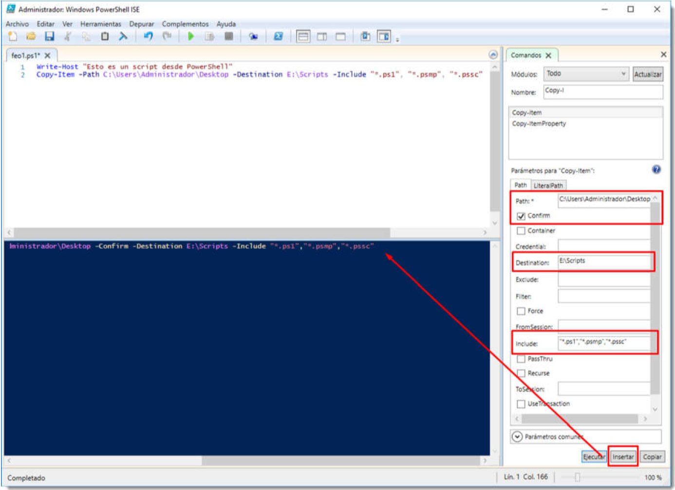 Dispone de autocompletado de comandos y parámetros que facilitará las tareas de creación de scripts. Basta con comenzar a escribir un cmdlet y pulsar la tecla Tab.