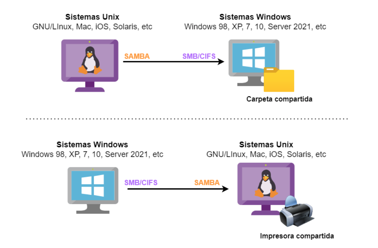 Samba es una implementación libre del protocolo SMB/CIFS de Microsoft para sistemas tipo UNIX. Permite que equipos con GNU/Linux, macOS o Unix actúen como servidores o clientes en redes Windows.