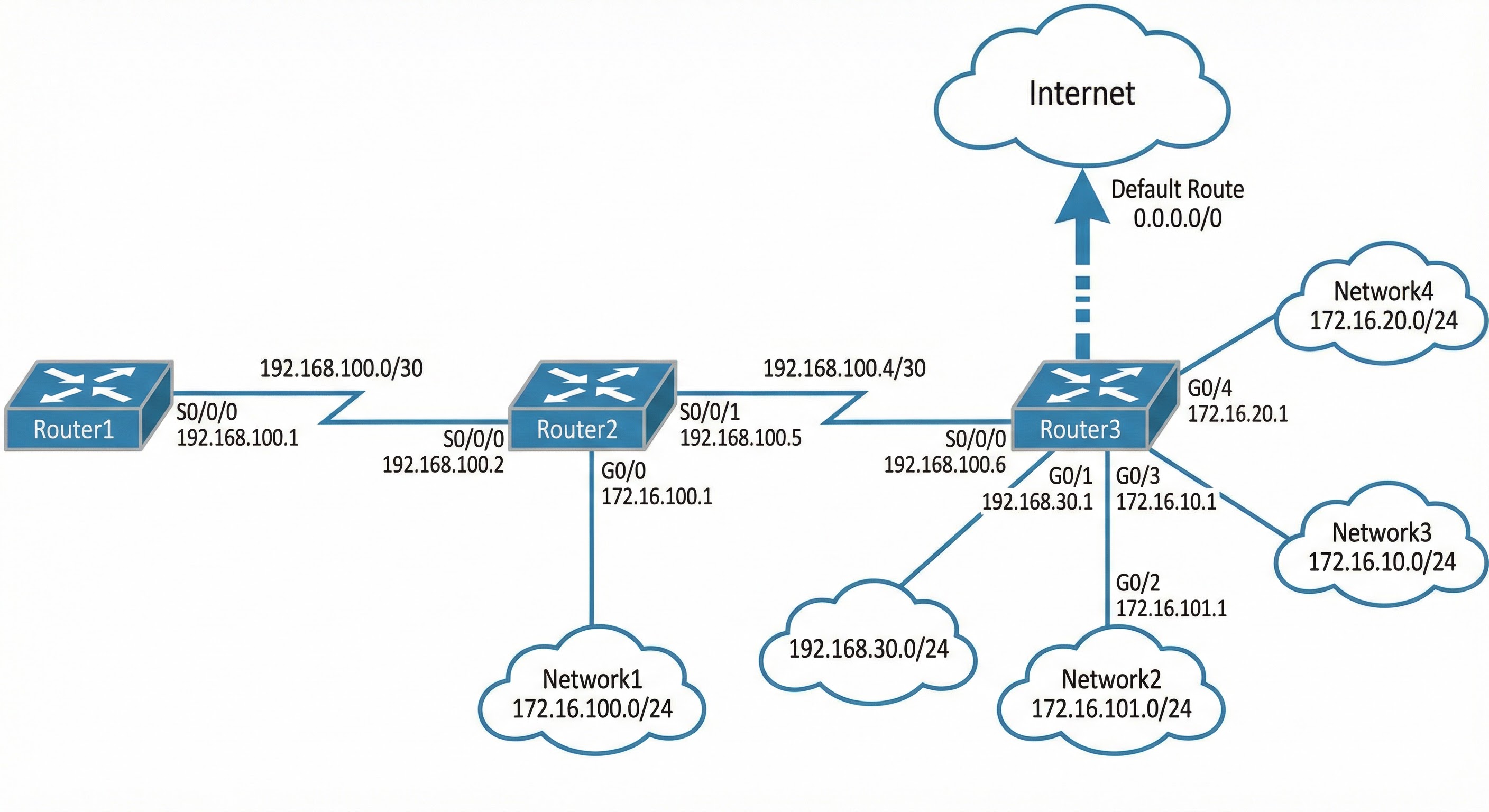 - AC708. (RA1 // CE1a, CE1c // 1-3p). Enrutamiento estático – Tabla del Router1. Partiendo de la misma topología del ejemplo (Router1 conectado solo a Router2 por 192.168.100.0/30, y Router2 a Router3 por 192.168.100.4/30, con el resto de redes e Internet detrás de Router2 y Router3):
